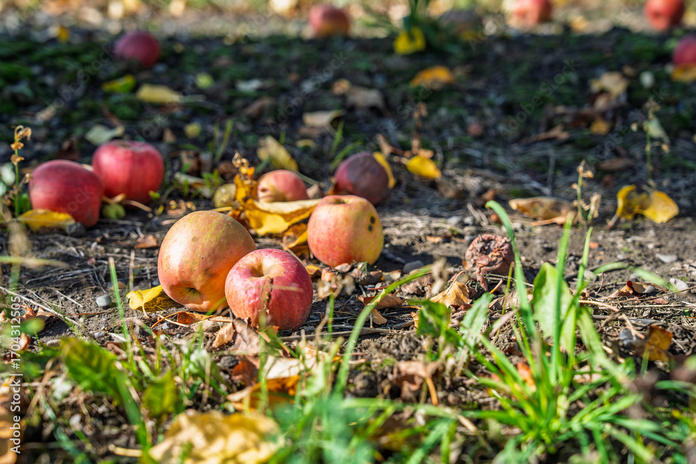 Fresh organic apples lying on soil ground surrounded by autumn foliage in harvest season