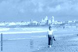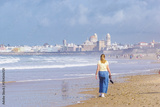 A woman contemplates the imposing Cadiz Cathedral from the seashore, on a beautiful sunny day