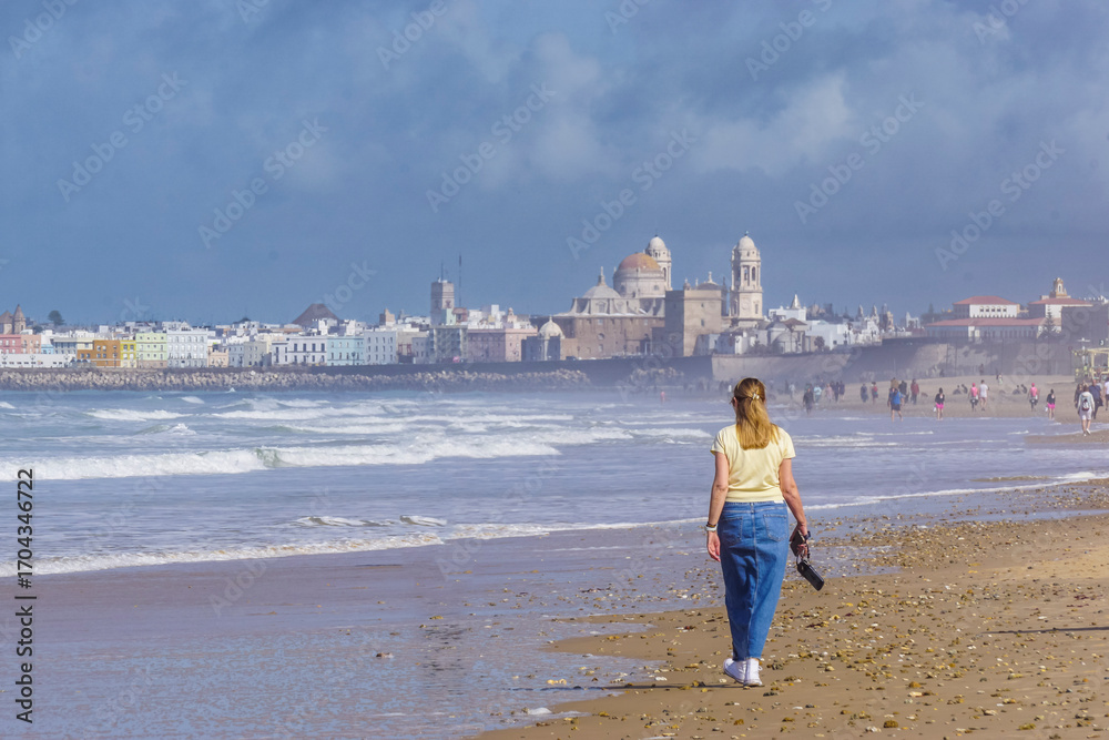 A woman contemplates the imposing Cadiz Cathedral from the seashore, on a beautiful sunny day