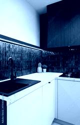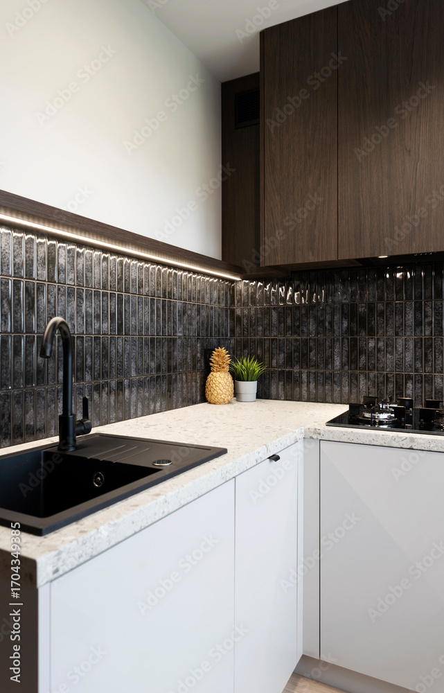 Modern kitchen in design house with dark tiles on the wall and stove on a counter. Furniture with kitchen sink in new apartment. Vertical.