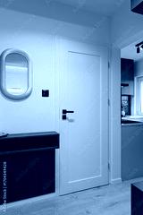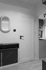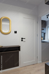 Hallway with white door, furniture and golden mirror on the white wall in the new apartment with window. Interior of corridor. Vertical.