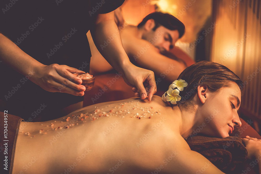 Couple customer having exfoliation treatment in luxury spa salon with warmth candle light ambient. Salt scrub beauty treatment in Health spa body scrub. Quiescent
