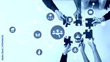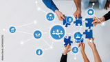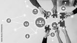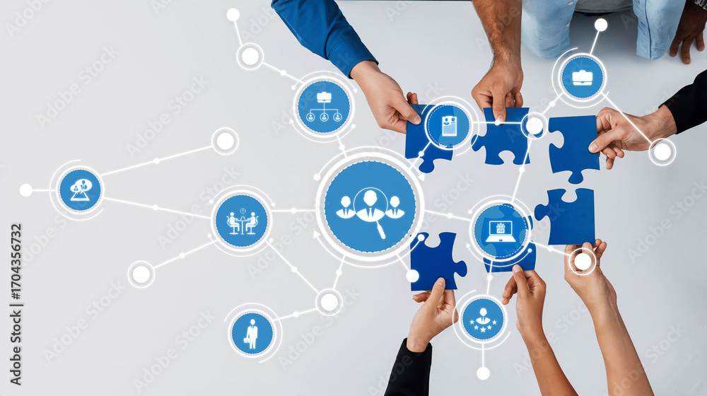 A dynamic scene showcasing diverse hands working together to assemble a puzzle, symbolizing teamwork, collaboration, and digital connections in a modern environment. Amity
