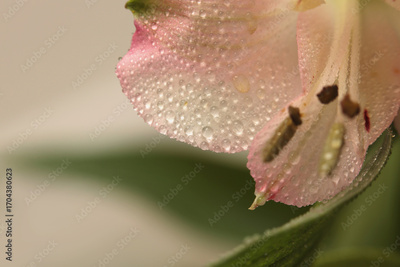 Soft focur blurred close-up cream pink pastel Alstroemerieae lily flower, green leaf with water drop. Macro smoke natural background.