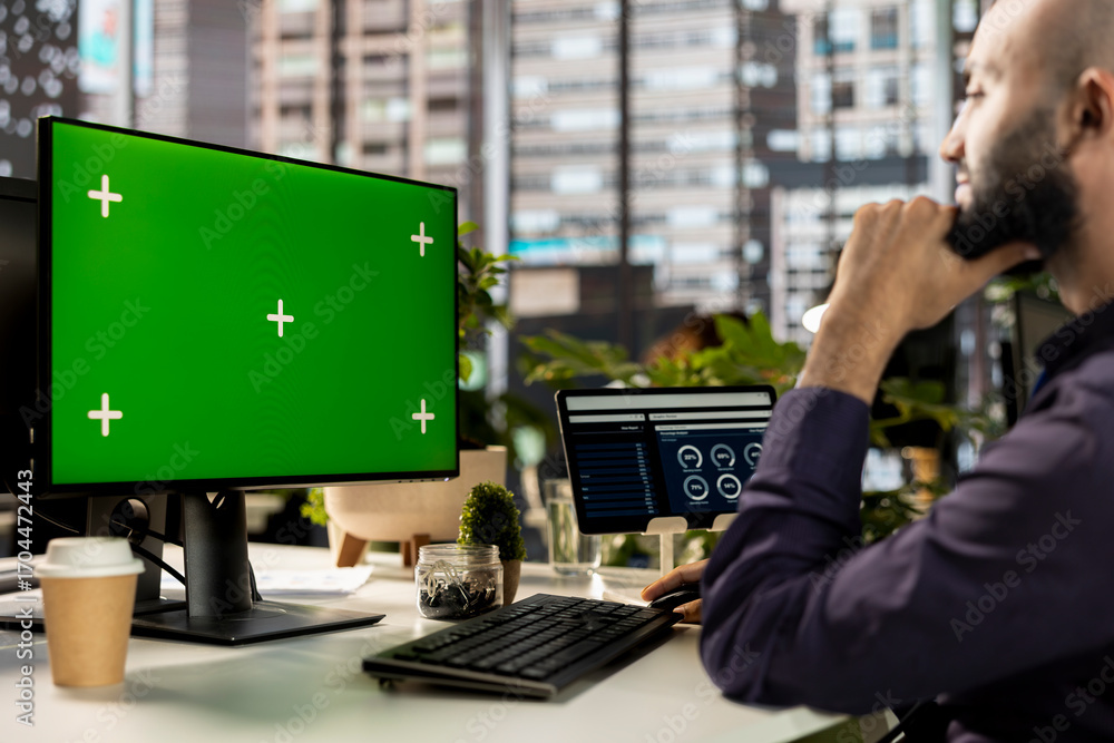 Middle eastern man working on accounting tasks next to green screen on pc, evaluating online analytics and performance metrics. Young employee reviewing data for a corporate briefing.