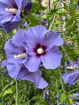 Purple hibiscus blooms and green foliage