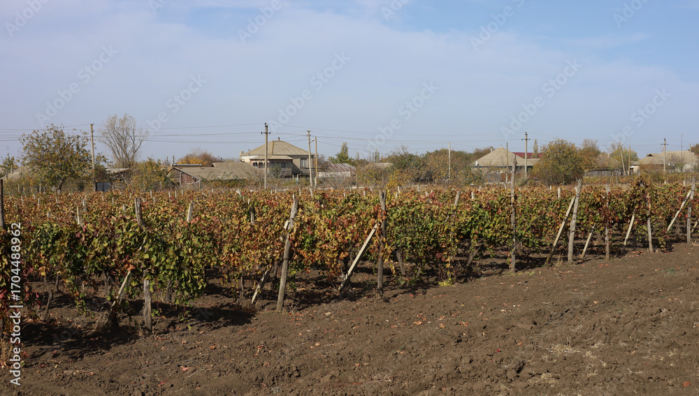 Vine against the blue sky. Vineyards in the autumn with red foliage. Winemaking. Macro photography of a leaf covered with dew. Selective focus.