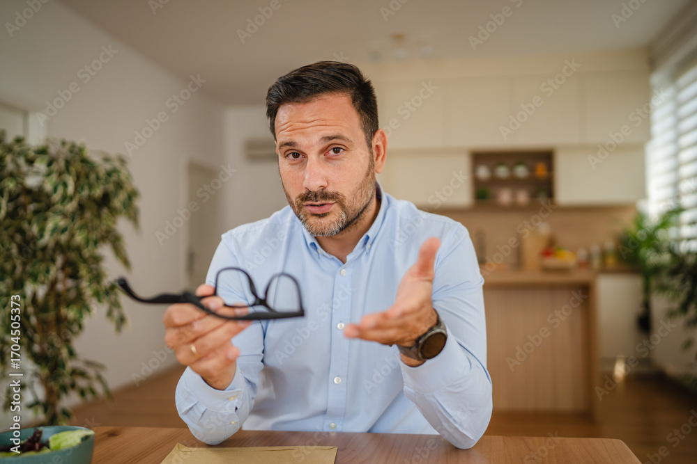 Businessman making video call and holding eyeglasses in home office