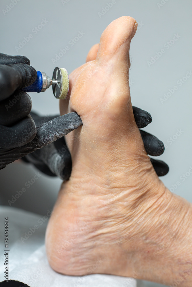 Rejuvenating pedicure for seniors. A beautician smoothes a woman's feet with dry, cracked skin. A pedicure at a beauty salon. Taking care of yourself