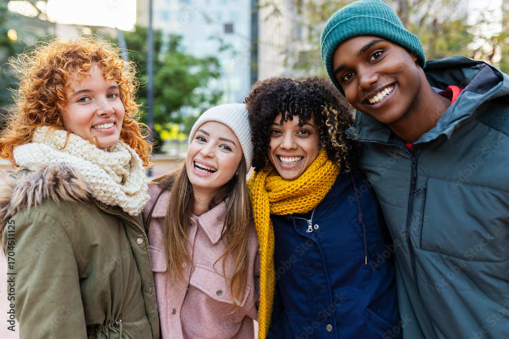 Group of diverse Gen Z friends in warm clothing standing together outdoors in winter day. Millennial people smiling at camera over urban city background. Friendship and youth concept
