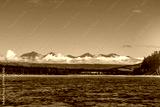 Mountain ridge with clouds covering the middle, peaks and base visible