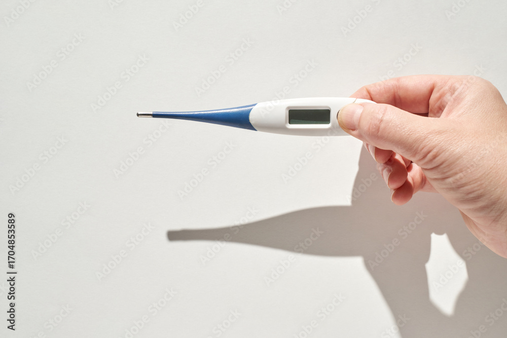 Caucasian adult hand holding digital thermometer against white background with shadow.