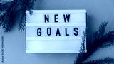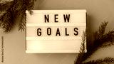 Lightbox with inspirational message NEW GOALS with fir branches on pastel background. Happy new year promises resolutions concept. Self growth and personal development