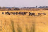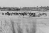 Telephoto shot of a large herd of Burchell's Plains zebras, Equus quagga burchelli, running on the dry lands of the Okavango Delta, Botswana.