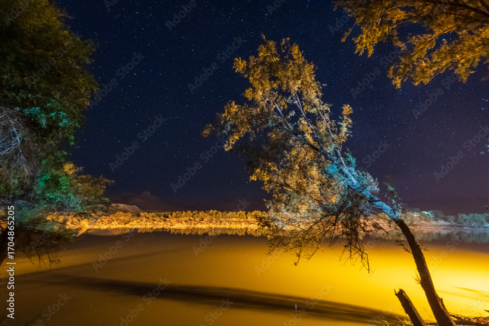 Outdoor scene depicting a starry sky over the orange river in South Africa.
