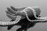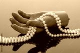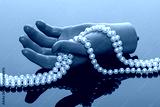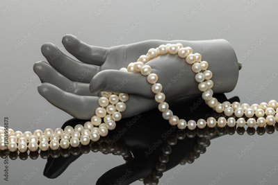 A necklace in three strands, made of natural pearls, on the wrist of a mannequin. Dark, mirrored background,