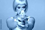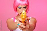 femme avec perruque rose et revolver en plastique