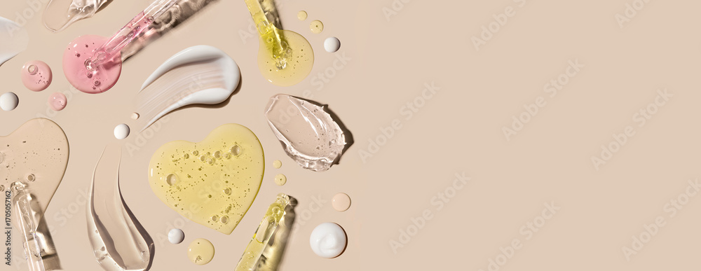 samples of cosmetic care products smear of cream texture on a beige background