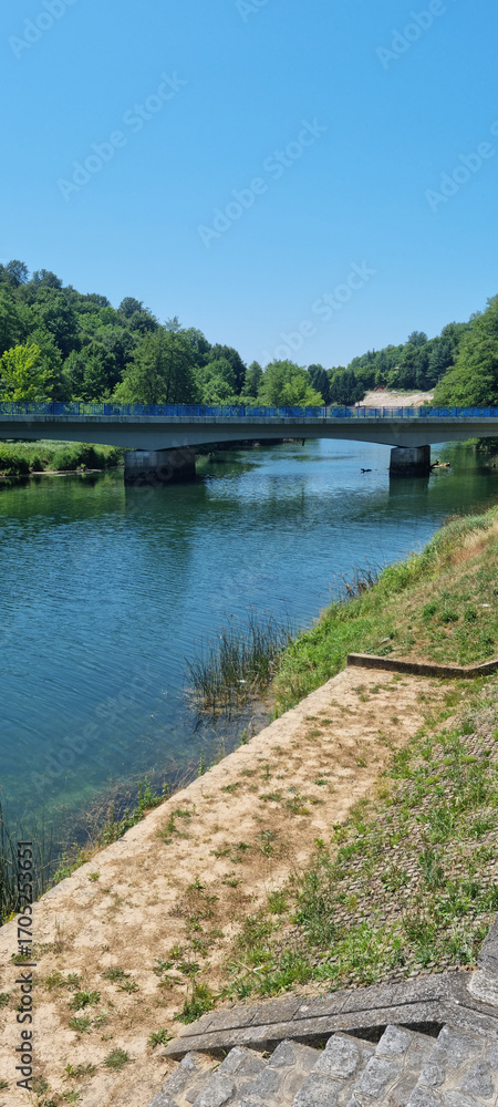 An elevated view shows a bridge over the Dobra River in Jarce Polje, with clear water, green banks, and a blue sky