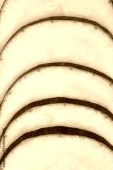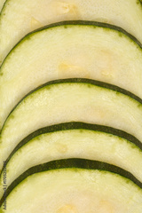 A close-up of circular zucchini slices arranged in a row, focusing on the texture and green edges
