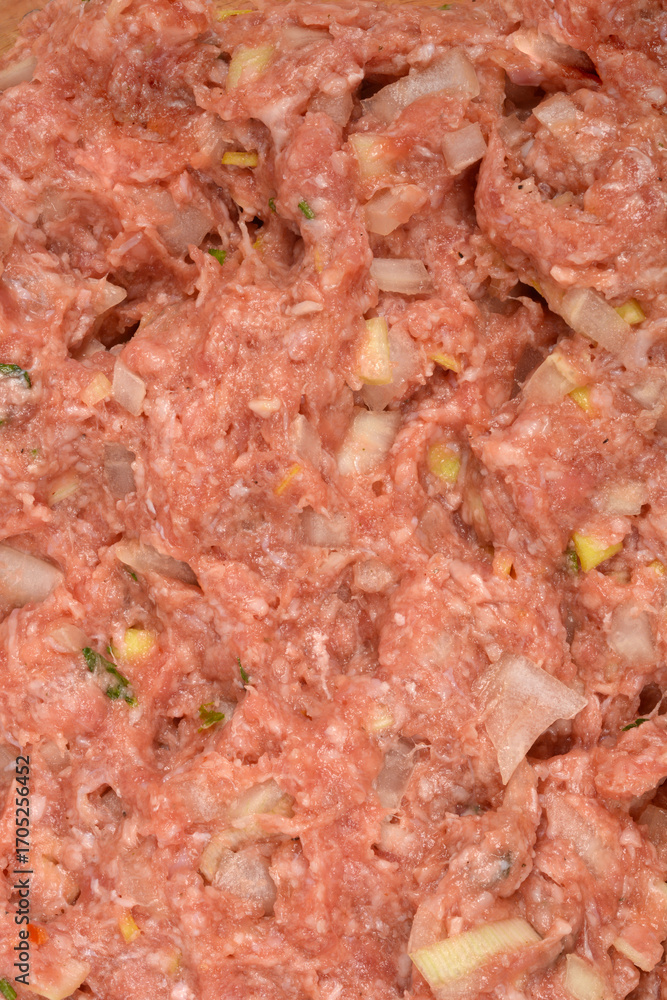 A macro shot of raw ground pork and beef mixed with onions and spices, showing the texture and detail of the unformed mixture
