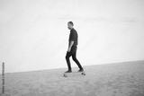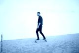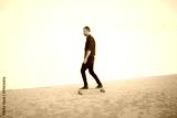 Young bearded man riding on skateboard, hipster with longboard in red shirt and blue jeans urban background