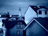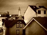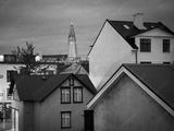 Timeless Reykjavík in monochrome, rooftops stretch beneath the watchful spire of Hallgrimskirkja, the modern cathedral consecrated in 1986, echoing the city's enduring spirit.