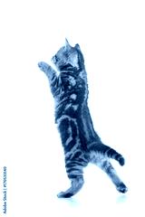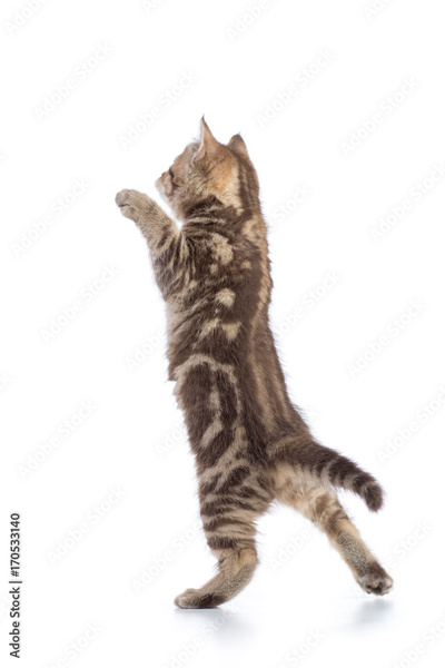 rear view of tabby-cat kitten standing on legs isolated on white