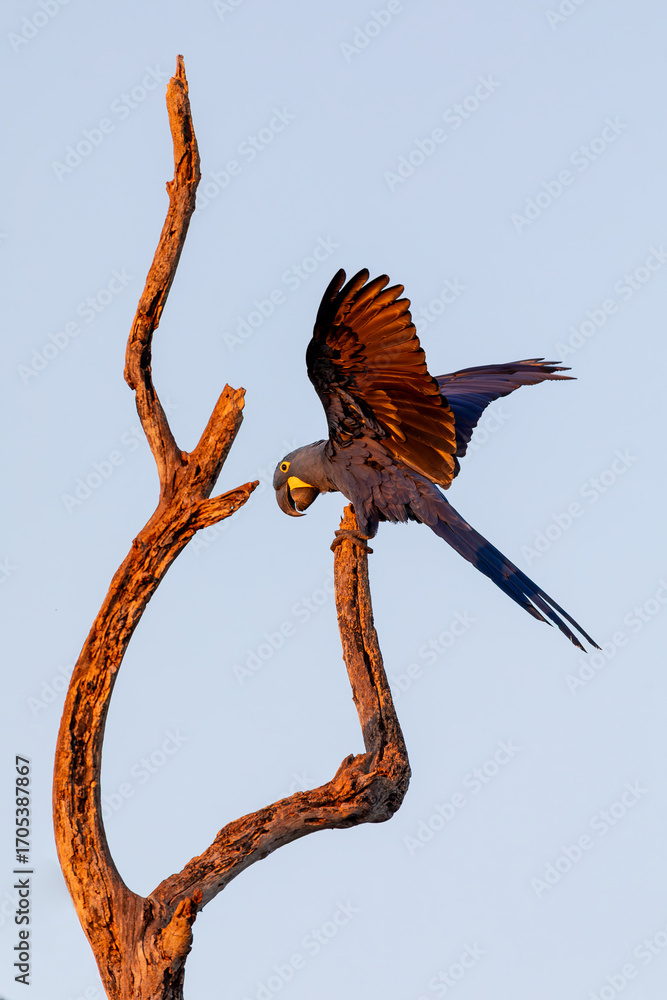 Hyacinth macaw (Anodorhynchus hyacinthinus), hyacinthine macaw, largest flying parrot species with brilliant blue plumage. Corumba, South Pantanal, Mato Grosso do Sul Brazil. Brazilian birdwatching.
