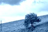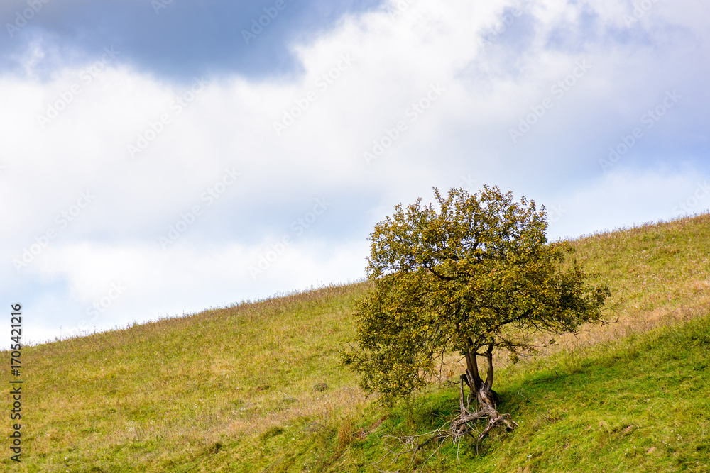 countryside scenery in autumn. single tree on the grassy hill in morning light. background with clouds on the blue sky. seasonal weather change in september