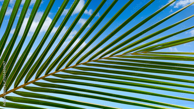 Leafy green palm tree with a blue sky in the background. The palm tree is the main focus of the image, and the blue sky serves as a beautiful backdrop. Concept of tranquility and relaxation.