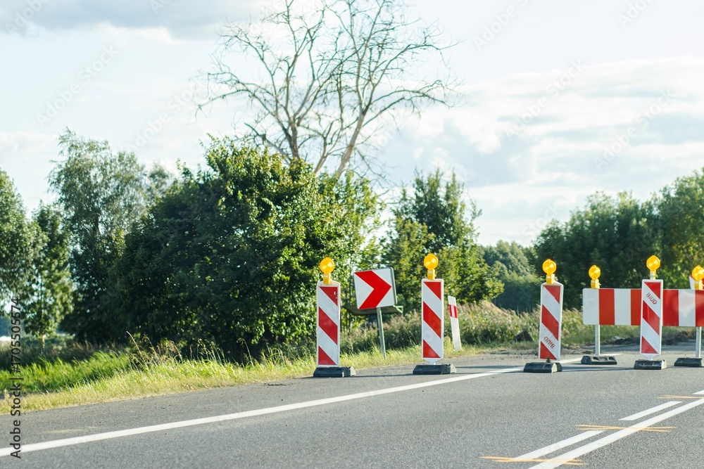 Road construction scene featuring traffic barriers and warning signs, surrounded by lush greenery and a clear sky, indicating ongoing roadwork and safety measures