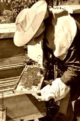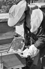 Beekeeper is working with bees and beehives on the apiary. Honeycomb with bees in hands of beekeeper