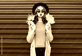 Fashion autumn portrait woman with yellow maple leaves on a red background
