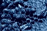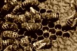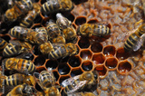 Bees on honeycomb. Close-up of bees on honeycomb in apiary in the summer.