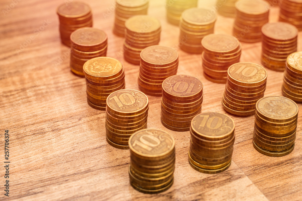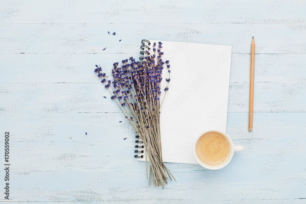 Morning cup of coffee, clean notebook and lavender flower on blue background top view. Woman working desk. Cozy breakfast. Flat lay style.