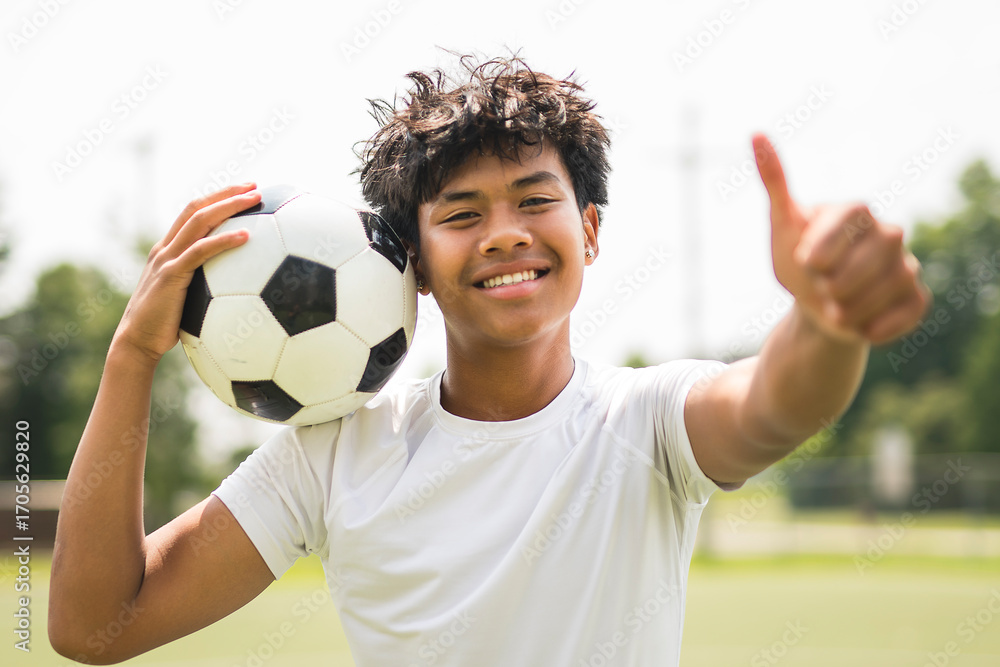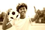 nice Boy with soccer ball outside on field