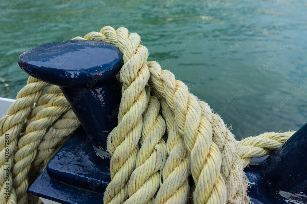 Closeup of an old yellow frayed boat rope, water background with landscape