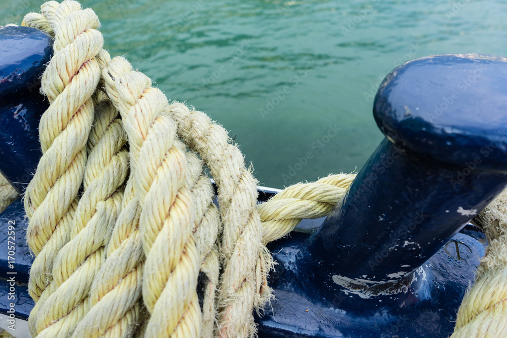 Closeup of an old yellow frayed boat rope, water background with landscape