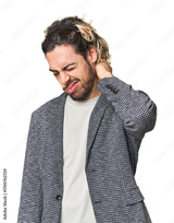 Young businessman in casual blazer suffering neck pain due to sedentary lifestyle.