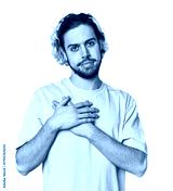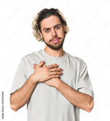 Young Caucasian man in studio setting has friendly expression, pressing palm to chest. Love concept.
