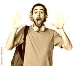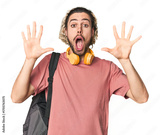Young student with backpack and headphones receiving a pleasant surprise, excited and raising hands.