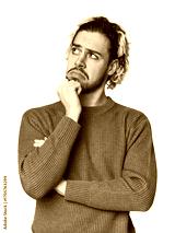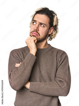 Young Caucasian man in studio setting thinking and looking up, being reflective, contemplating, having a fantasy.