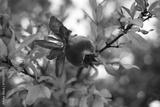 A single young, reddish-brown pomegranate fruit hangs from a branch, surrounded by bright green and red leaves with a soft, natural background (bokeh).