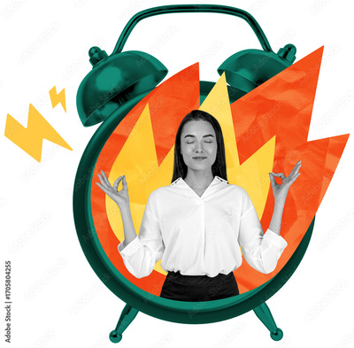 Calm woman meditating with closed eyes inside green alarm clock surrounded by flames and lightning, collage style on white background, stress relief concept