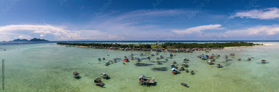 Aerial view of sea gypsy village over clear turquoise waters in Kulapuan Island Semporna, Sabah, Malaysia. Scenic seascape with coral reefs, coastal village, and blue tropical sky.