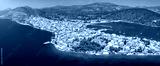 Panoramic aerial view of the town of Ermioni, situated on a peninsula with pine tree forest, Peloponese, Greece