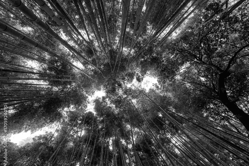 Black and white upward view in Arashiyama Bamboo Grove, Kyoto, Japan shows textured canopy where crowns and light form an abstract pattern with ornamental depth