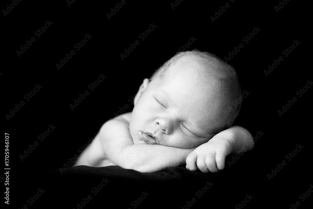 Newborn Baby Sleeping Peacefully - Black and White Portrait Isolated on Black