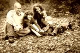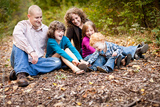 Happy Family Sitting, Playing, and Laughing Together on Trail in Woods